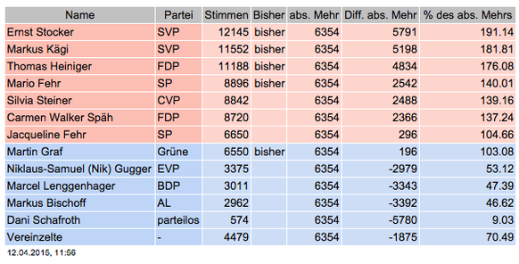 Die erste Hochrechnung ist da: Demnach dürften Stocker (SVP), Heiniger (FDP), Mario Fehr (SP), Kägi (SVP), Steiner (neu, CVP), Jacqueline Fehr (neu, SP) und Walker Späh (neu, FDP) gewählt werden.