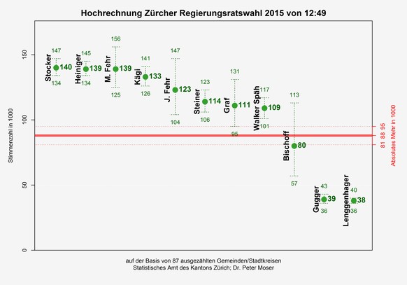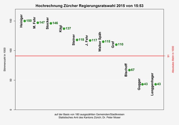 Die Hochrechnung bei den Regierungsratswahlen von 14:41 Uhr bringt wenig Veränderung mit sich: Mario Fehr (SP), Heiniger (FDP), Stocker und Kägi (beide SVP) drin. Jacqueline Fehr und Steiner (CVP) sehr wahrscheinlich drin. Walker Späh (FDP) und Graf (Grüne) kämpfen um den siebten Platz.