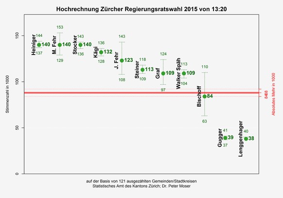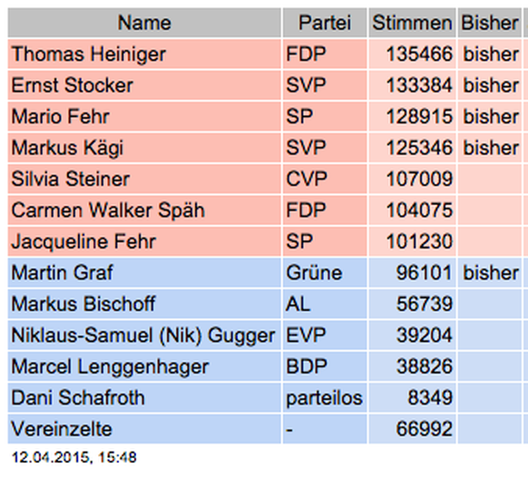 Stocker (SVP), Heiniger (FDP), Mario Fehr (SP) und Kägi (SVP) dürften die Wiederwahl problemlos schaffen. Die Sozialdemokratin Jacqueline Fehr, die als neue Kandidatin antritt, dürfte nach vorliegenden Hochrechnungen ebenfalls den Sprung in den Regierungsrat schaffen.