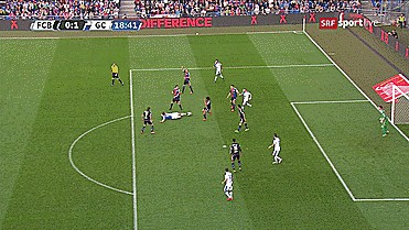 Eckball GC, viel Theater, viele Pfiffe und dann hämmert Yoric Ravet das Leder dem ersten Basler an den Kopf. Der folgende Konter der Basler verläuft im Sand.