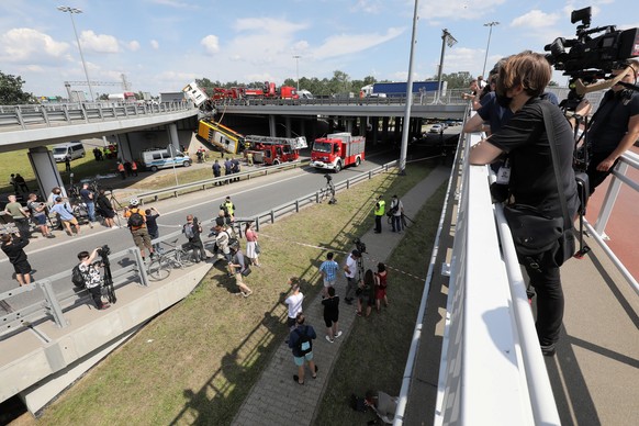 Der Gelenkbus hatte auf der Überführung einer Autobahn über eine Schnellstrasse am Weichselufer die Leitplanke durchbrochen. Aufnahmen des Senders TVN24 zeigten, dass das Vorderteil des Busses in die Tiefe gestürzt war. Der hintere Teil des Busses hing noch fest.