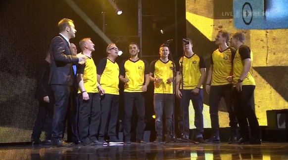 Bild des Abends: Kuno Lauener und YB-Spieler singen I schänke dir mis Härz.