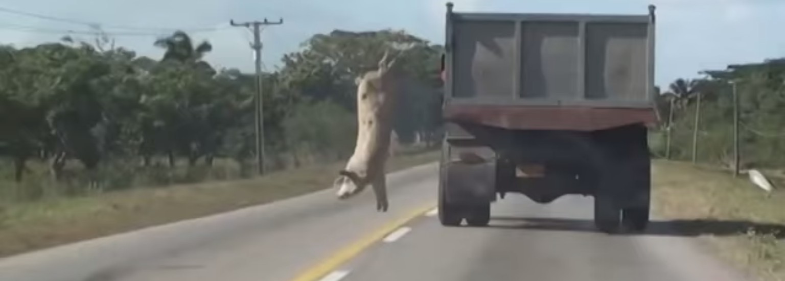 Ob dieses Schwein weiss, was ihm blüht? Ist es vielleicht auf dem Weg ins Schlachthaus? Vielleicht. Der Dramatik zuliebe wollen wir das jetzt mal annehmen. Denn sein tapferer Sprung aus dem fahrenden Lastwagen lässt fast keinen anderen Schluss zu, als dass das Tierchen hier ohne wenn und aber verschwinden will: Ab in die Freiheit.