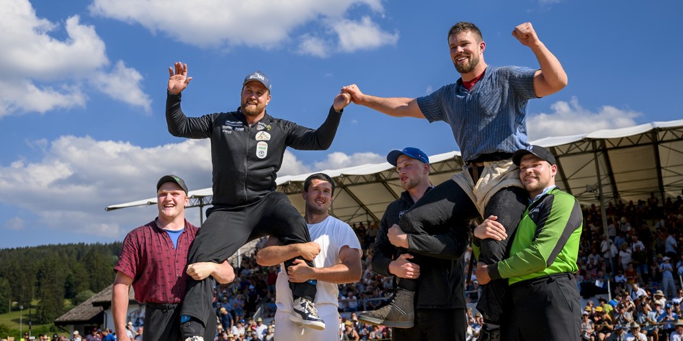 Matthias Aeschbacher (links) und Fabian Staudenmann lasse sich als gemeinsame Sieger am Bernisch-Kantonalen Schwingfest in Tramelan feiern.Bild: KEYSTONE/Jean-Christophe Bott