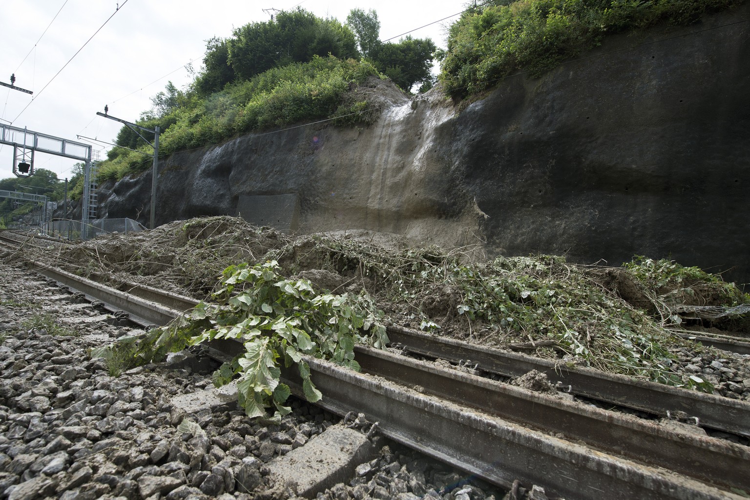 «Heute wird kein Zug mehr auf dieser Strecke verkehren», sagte SBB Mediensprecher Reto Schärli am Sonntagmittag gegenüber watson. Rund 40 Kubikmeter Geröllmasse und Erde blockierten die Geleise. Schlimmer als dies, waren jedoch 300-500 Kubikmeter instabile Geröllmasse, die am Hang oberhalb der Geleise ins Tal zu rutschten drohte. Spezialisten versuchten am Sonntag, die mit Wasser voll gesogene Masse unter Kontrolle zu bringen. Im Verlaufe des Montags soll vorerst ein Gleis wieder für den Bahnverkehr freigegeben werden.