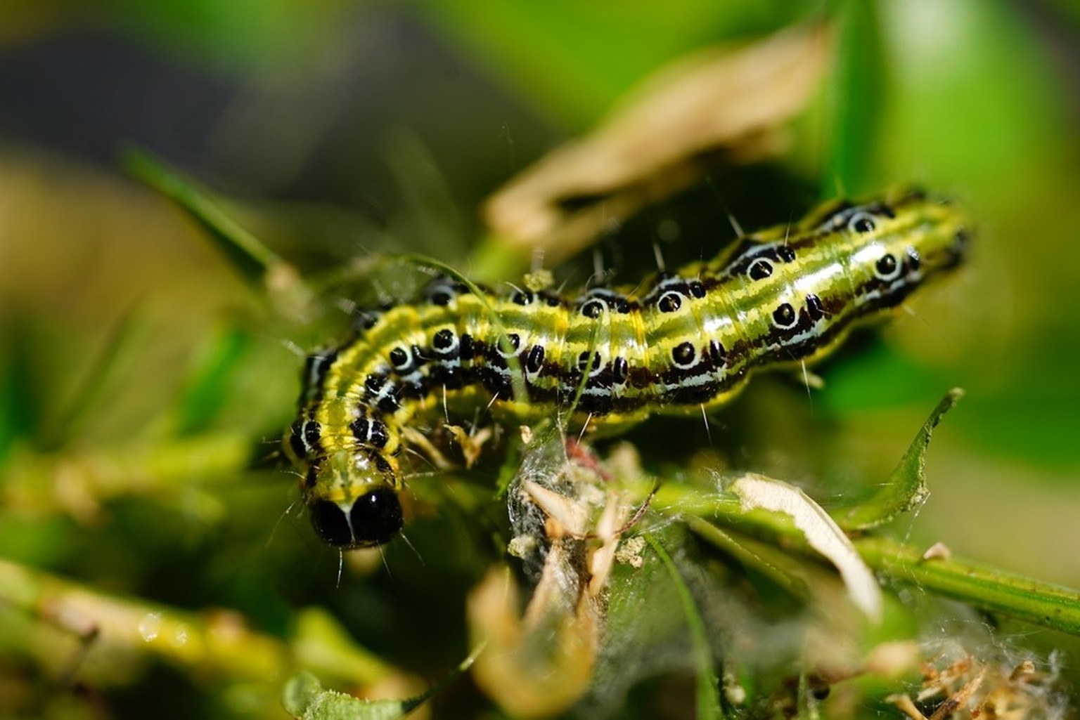 Du kannst mich als männlichen Falter mit dem Pheromon des Weibchens leicht in eine Falle locken. Dadurch begrenzt du meine Vermehrung und entdeckst mich frühzeitig. Zudem habe ich viele natürliche Feinde. So werde ich als nachtaktiver Falter von Fledermäusen gejagt. Und als Raupe haben mich Haussperlinge, Kohlmeisen und Wespen als proteinreiche Nahrung entdeckt. Ausserdem gibt es Gärtnerinnen und Gärtner, die ihre Buchsbäume mit einem scharfen Wasserstrahl oder Laubbläser durchpusten und mich danach einsammeln.