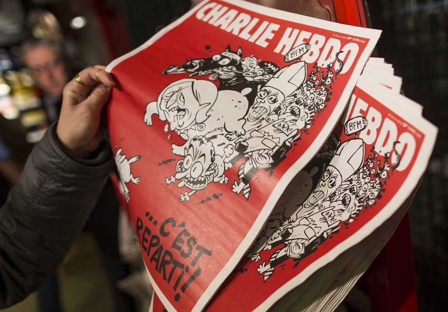 — Patrick Pelloux (@PatrickPelloux) 23. Februar 2015Gegenüber «Libération» meinte der zeichnende Rénald Luzier: «Charlie beginnt seine Arbeit, gegen die Dummheit, gegen den FN [Front National].» Er hat auch wieder das Titelbild gestaltet. FN-Chefin Marine Le Pen, Ex-Präsident Sarkozy, der Papst und ein bewaffneter Islamist hetzen einem kleinen Hündchen hinterher, das mit der Satirezeitung im Maul davonrennt. Luzier wollte «zurück zur fröhlichen Kritik von ‹Charlie Hebdo›».