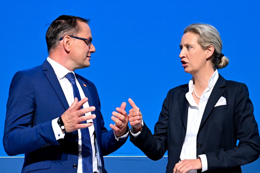 Tino Chrupalla und Alice Weidel stehen künftig gemeinsam an der Spitze der AfD. Beim Bundesparteitag im sächsischen Riesa votierte eine relativ knappe Mehrheit (53,4 Prozent) am Samstag dafür, Chrupalla für weitere zwei Jahre im Amt zu belassen. Weidel rückt von der stellvertretenden Parteichefin in die Position der gleichberechtigten Co-Sprecherin auf. Sie erhielt 67,3 Prozent der Stimmen. Zusammen führt das Duo damit nun sowohl die Bundestagsfraktion als auch die Bundespartei an. Vielleicht auch um zu zeigen, dass sie reibungslos zusammenarbeiten können, hatten sich Weidel und Chrupalla gegenseitig als Kandidaten für den Chefposten vorgeschlagen.