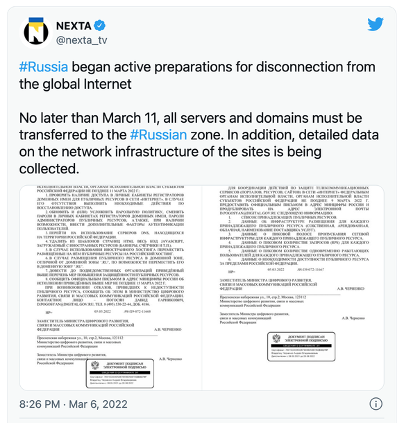 In jenem Test seien russische Provider aufgefordert worden, das Internet innerhalb der russischen Grenzen so zu konfigurieren, als wäre es ein riesiges Intranet – ein privates Netzwerk von Websites, die nicht mit der Aussenwelt kommunizieren. Jetzt scheine es, dass Russland diese Systeme erneut teste – wie das Memo der russischen Regierung zeige.