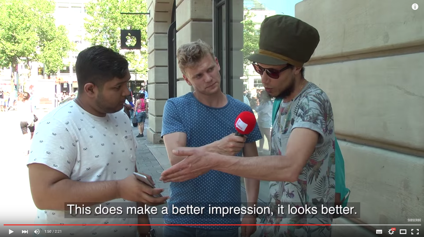 Die YouTuber wollten es genau wissen und hakten nach: «Warum ist das besser als Android?» Einer jungen Frau fällt zwar kein handfester Grund ein, eine Antwort hat sie aber dennoch parat: «Ich weiss nicht, Apple ist einfach entspannt.» Eine andere Person macht es sich mit ihrer Erklärung noch einfacher: «Apple ist immer besser.»