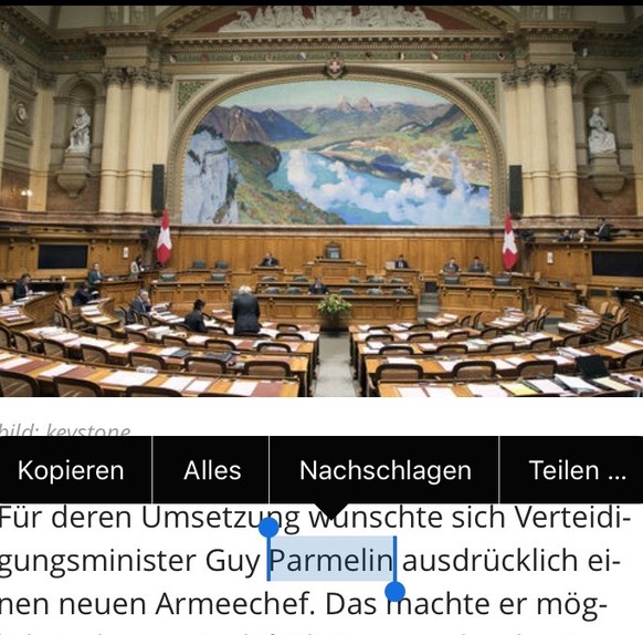 Nehmen wir mal an, du liest gerade in deiner Lieblings-App und willst mehr über «Parmelin» herausfinden. Nichts leichter als das: Das Wort markieren und auf «Nachschlagen» tippen ...