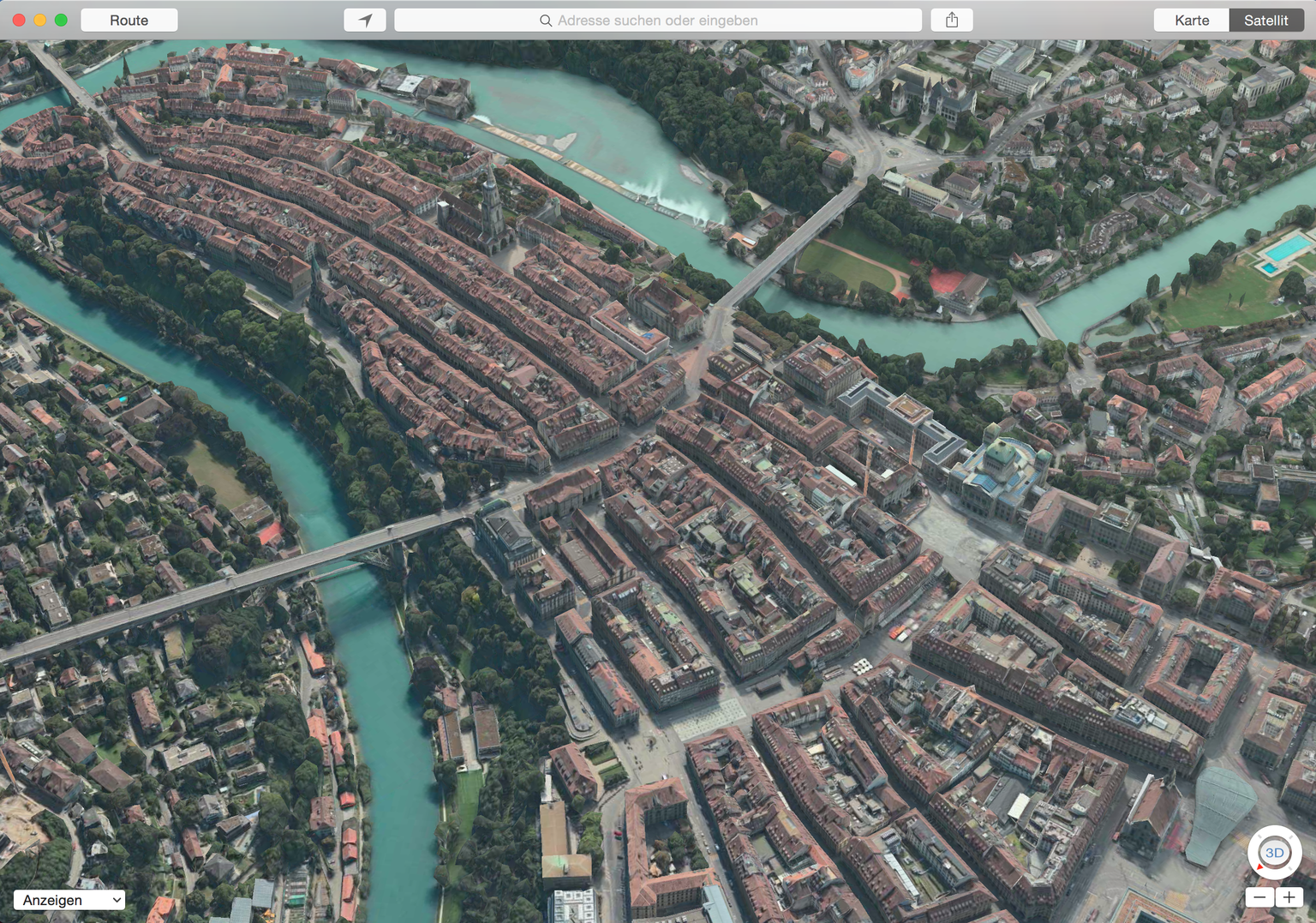 Es hat ziemlich lang gedauert, doch nun kann auch die Schweizer Hauptstadt bei Apple Maps aus der Vogelperspektive in 3D erkundet werden. Besonders eindrücklich sind dabei die Häuser der Altstadt, die in einer Schleife des Hausflusses Aare liegen.