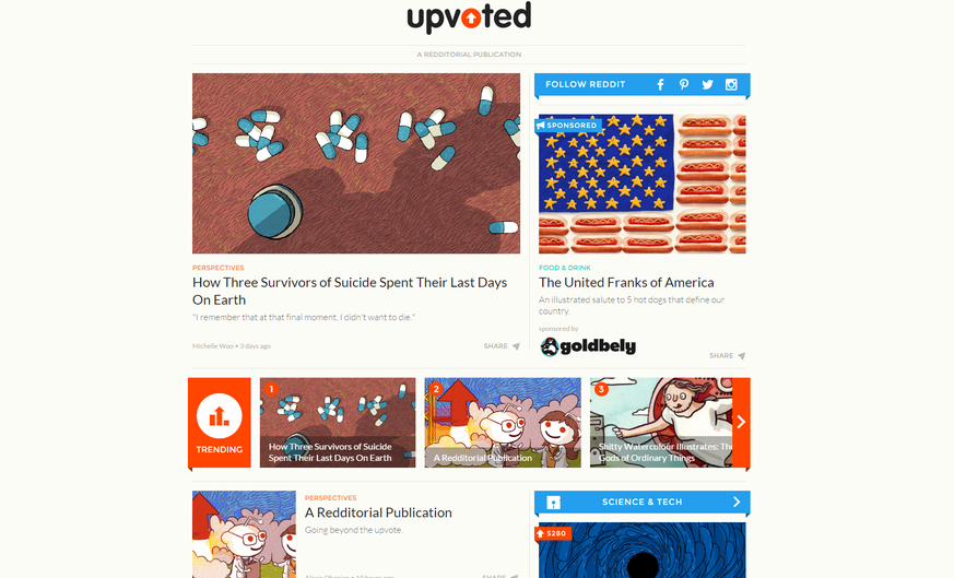 Im Vergleich zum spartanischen Auftritt von Reddit, wirkt Upvoted farbenfroher und zeitgemässer. Das Redaktions-Team plant täglich rund 20 Beiträge, mit dem Ziel irgendwann auf 40 aufzustocken, verrieten die Macher gegenüber der Tech-Webseite Wired.