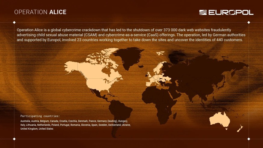 An der von der europäischen Polizeibehörde Europol koordinierten «Operation Alice» beteiligten sich 23 Staaten – neben zahlreichen europäischen Ländern, darunter die Schweiz, auch die USA, Kanada und Australien.