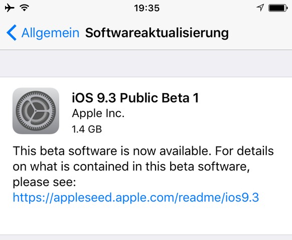 Wichtig: «iOS 9.3 Public Beta 1» ist eine in Entwicklung befindliche Version. Daher ist nicht zu 100 Prozent auszuschliessen, dass es zu kleineren Software-Problemen kommen könnte. Andererseits ist davon auszugehen, dass Apple die erste Public Beta erst für den Download freigibt, wenn keine grösseren Probleme mehr zu erwarten sind.