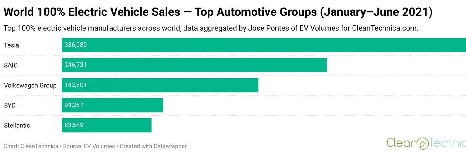 In der ersten Jahreshälfte verkaufte Tesla 2,5 Mal mehr E-Autos als VW mit seinen E-Autos und Plug-in-Hybriden zusammen (nur die Marke VW, nicht alle Volkswagen-Marken zusammen)