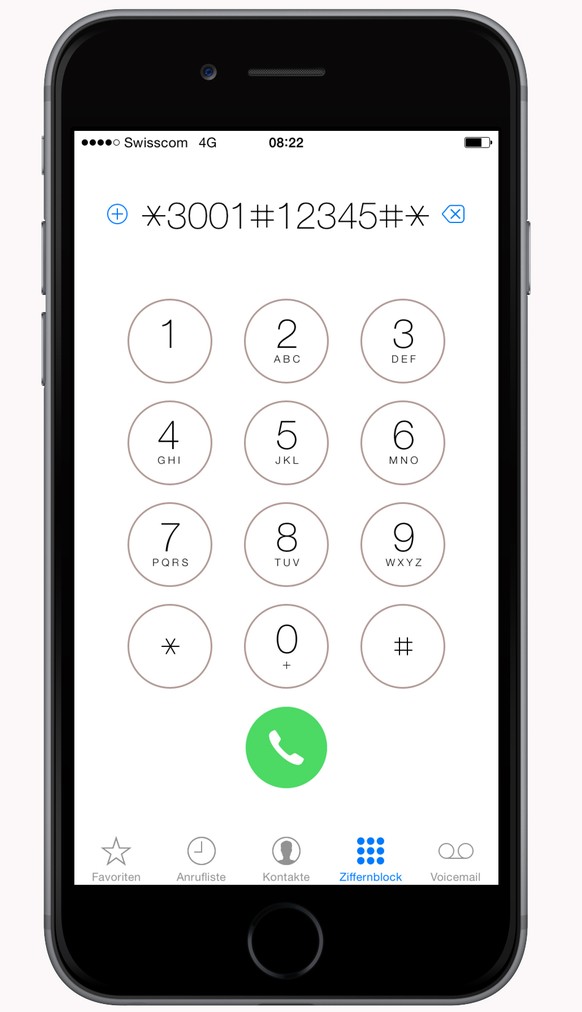 1. Man ruft die Telefon-App auf, gibt im Ziffernblock Folgendes ein: