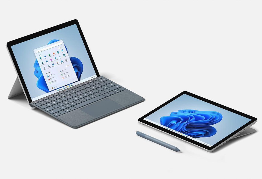 Das Surface Go 3 ist der kleine Bruder des Surface Pro 8. Die dritte Generation des 2-in-1-Allrounders kommt mit einem 10,5-Zoll-Display (1920 mal 1280 Pixel) und Intel-Pentium-Gold- oder Intel-Core-i3-Prozessor, der gegenüber dem Vorgänger bis 60 Prozent schneller sein soll. Die Akkulaufzeit gibt Microsoft mit bis zu 11 Stunden an.