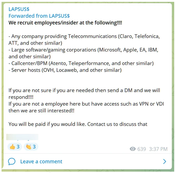 Sicher ist: Die Lapsus$-Hacker haben keinen Respekt vor grossen Namen. Im Gegenteil. Sie nehmen gezielt Marktführer und Techgiganten ins Visier, wie ein am 10. März bei Telegram veröffentlichter Aufruf zeigt. Demnach sollen Firmen-Insider den Hackern Zugänge zu geschützten IT-Systemen vermitteln. Falls gewünscht gegen Bezahlung, wie es heisst.
