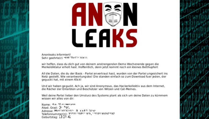 Die aus der Querdenker-Szene hervorgegangene Partei «dieBasis» ist gehackt worden: Die Gruppe Anonymous ist offenbar an die Daten aller Mitglieder gelangt. «dieBasis hat ein Problem: uns», erklärt das Hackerkollektiv. Die Daten sind offenbar echt. Der deutsche watson-Medienpartner t-online hat Einblick bekommen und Stichproben prüfen können. Anonymous kündigte weitere Veröffentlichungen und Auswertungen an. Es ist aber nicht damit zu rechnen, dass Anonymous die Daten einfacher Mitglieder veröffentlicht.