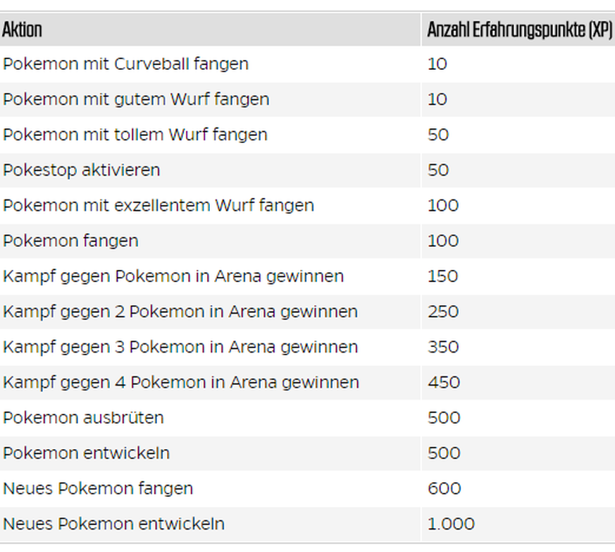 Bei Pokémon Go gibt es für diverse Aktionen unterschiedlich viele Erfahrungspunkte. Die folgende Tabelle des Online-Portals Netzwelt gibt einen Überblick.