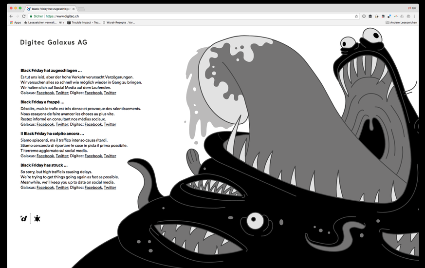 Das müssen extremste Trafficausschläge sein! Detailhändler, die es letztes Jahr schon traf, wie #interdiscount und für mich doch eher überraschend auch #digitec_de mit #Blackout am #BlackFriday. In Gedanken bei den Server-Admins. @vsvch pic.twitter.com/Q2UaSGcwk8