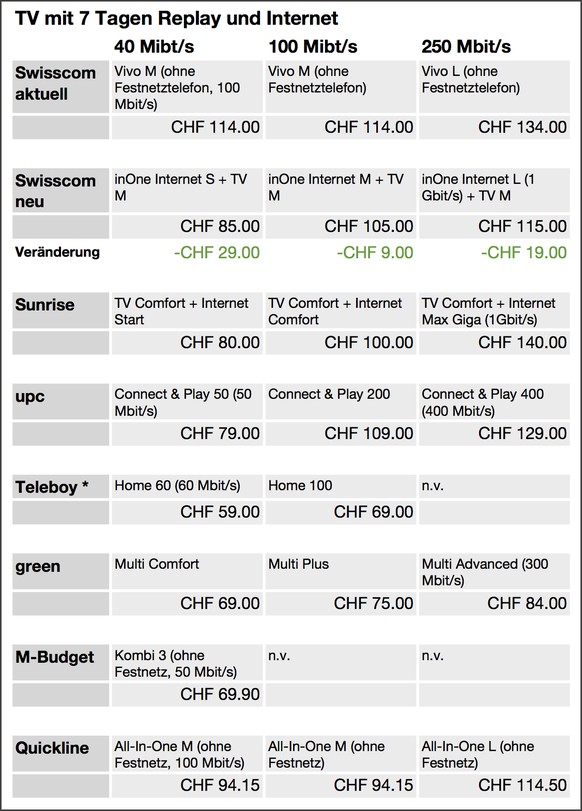 Update: Ein Leser schreibt: «UPC Connect 40 für 49.- pro Monat enthält auch TV (und selbst Festnetz), wäre also unter Punkt 1 aufzuführen und dort ganz klar das günstigste Angebot.»