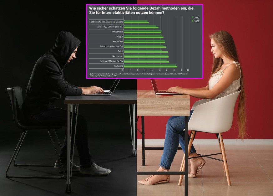 Beim Zahlen im Internet hat das Vertrauen bis 2020 stets abgenommen, nun sei eine leichte Trendwende zu beobachten, insbesondere sei das Vertrauen in Twint markant gestiegen, heisst es in der Comparis-Umfrage. Das Bezahlsystem der Schweizer Banken erreicht inzwischen fast den gleichen Vertrauenswert wie das Bezahlen per Postcard / Maestro-Karte oder per Nachnahme. Weiterhin kritisch eingestellt sind Schweizer gegenüber Kryptowährungen sowie den Bezahldiensten von Apple, Samsung oder Google.