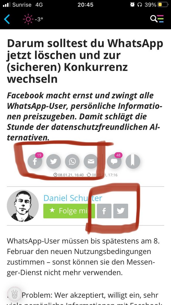 Persönlich empfehle ich den Umstieg zu Signal oder Threema. Der Schweizer Messenger bietet einige Vorteile im Vergleich mit der datenhungrigen Konkurrenz aus den USA: