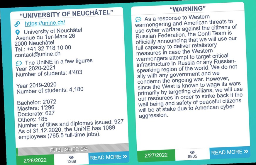 Am Montag prangte auf der Leak-Site von Conti das kürzlich veröffentlichte Bekennerschreiben zum Angriff auf die Schweizer Universität direkt neben der Botschaft, die offenbar zum Zerwürfnis der kriminellen Vereinigung führte.