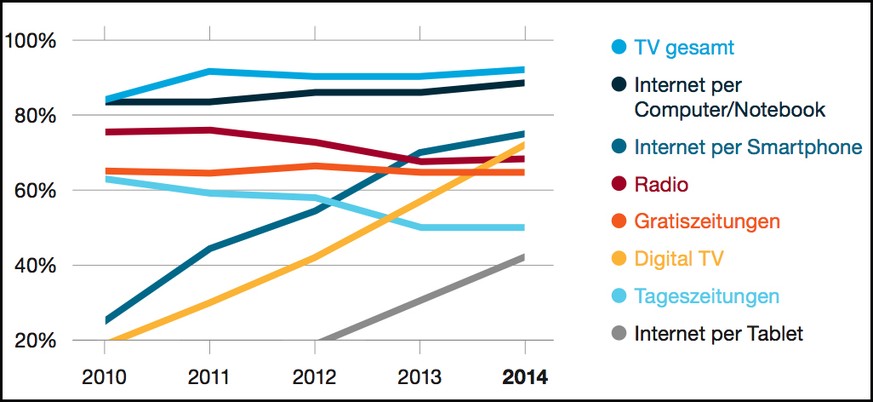 Die Internetnutzung per Smartphone konnte 2014 nochmals zulegen und beträgt neu 75 Prozent. Bei der Internetnutzung per Tablet gehören die Schweizer mit 42 Prozent gar zur Weltelite. Insgesamt greifen bereits vier von fünf Personen über mobile Geräte auf das Internet zu.