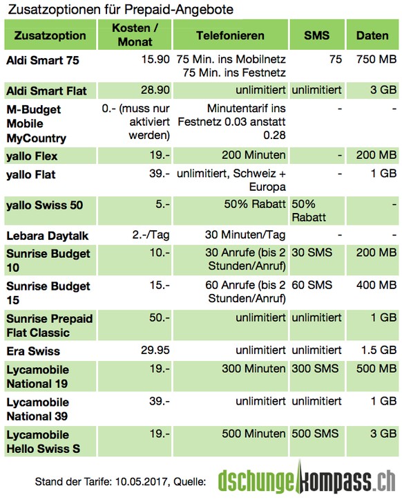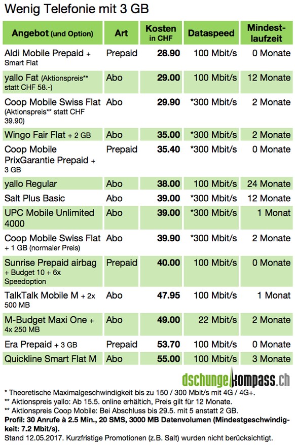 Die aufgelisteten Tarife und Optionen sind nur ein Auszug der verfügbaren Angebote. Mit dem Tarifrechner von Dschungelkompass kann man für das persönliche Nutzungsprofil die günstigsten Abos und Prepaid-Angebote berechnen. Der Tarifrechner findet laut Dschungelkompass als einziger Vergleichsdienst alle Abos und Prepaid-Angebote in Kombination mit sämtlichen möglichen Zusatzoptionen aller Schweizer Anbieter.