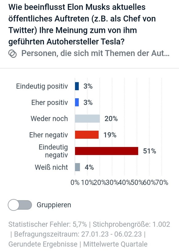 Und genau das ist bereits geschehen. Eine Umfrage des Erhebungs-Instituts Civey im Auftrag von t-online zeigt: Das Tesla-Image braucht dringend ein Facelift. Nur jeder Zehnte findet die Marke noch sympathisch; 70 Prozent hingegen weniger. Oder gar nicht. 70 Prozent sagen auch, Musks Verhalten schade Tesla.