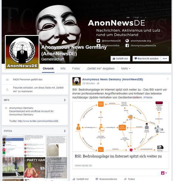 — Andreas Rickmann (@a_rickmann) 18. November 2015Die Medienpräsenz von Anonymous hilft einer Facebook-Seite, die unter dem Namen «Anonymous.Kollektiv» Hass-Botschaften verbreitet