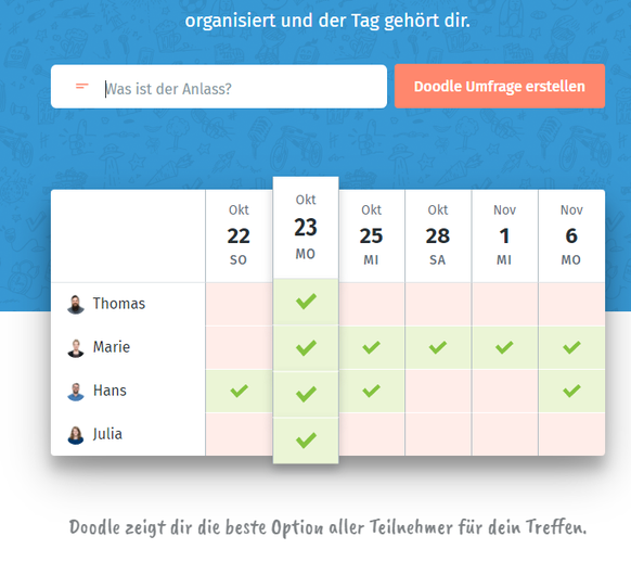 Zumindest in der Schweiz ist Doodle vermutlich seit Jahren eines der beliebtesten Online-Tools, um rasch einen Termin zu finden, der allen passt. Trotz oder gerade wegen seiner Popularität gehört Doodle definitiv in diese Liste.