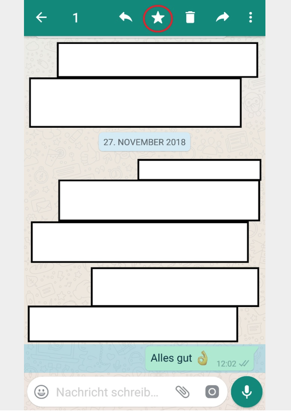 Wenn man eine Chatnachricht für später speichern möchte, kann man sie mit einem Stern markieren. Drücke dafür auf die gewünschte Nachricht, bis sie markiert ist. Im Menü oben wählt man nun den Stern.