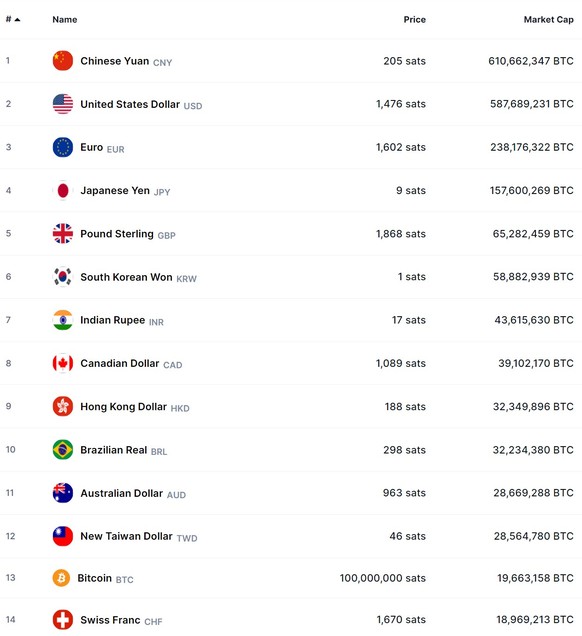 Einen «lustigen» Vergleich stellt Coinmarketcap an – und stellt den Wert des sich im Umlauf befindenden Geldes verschiedener Länderwährungen der Kryptowährung Bitcoin gegenüber. In dieser Liste hat Bitcoin soeben den Schweizer Franken auf den Platz 14 verdrängt.