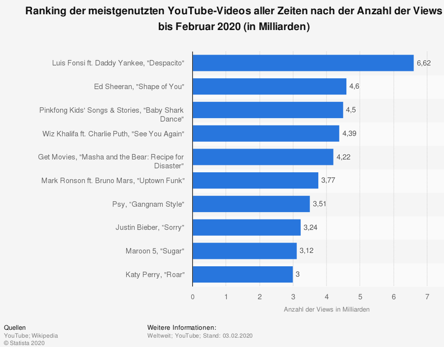 Die 10 meistgesehenen YouTube-Videos nach Anzahl der Views bis Februar 2020 (in Milliarden)