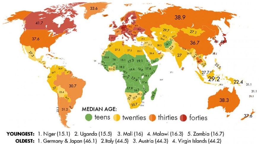 Deutschland und Japan haben mit 46 Jahren das höchste Durchschnittsalter. In Afrika liegt das Durchschnittsalter teils unter 20 Jahren.