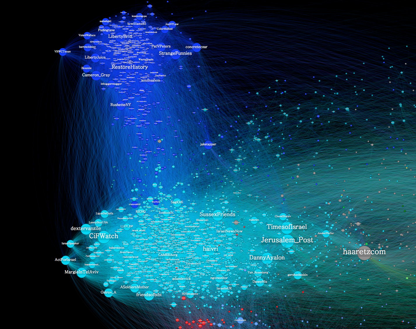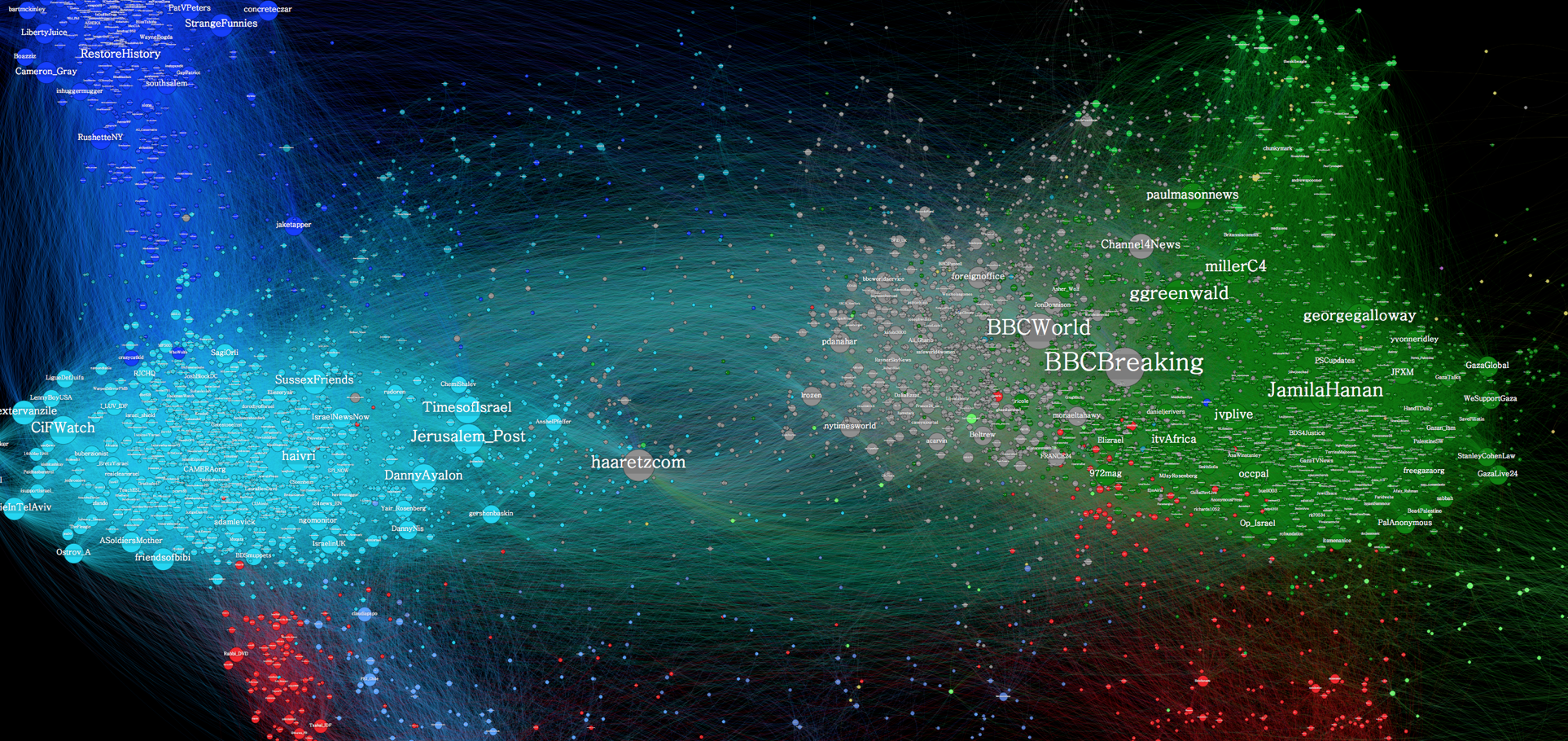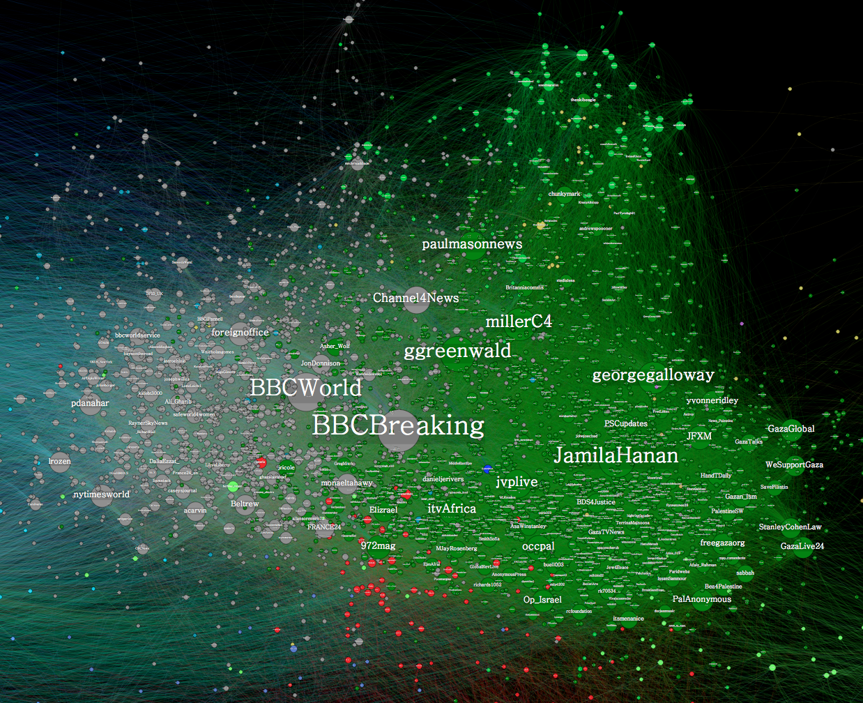 Datenanalyst Gilad Lotan schreibt: «Das graue Cluster von Bloggern, Journalisten und internationalen Medien ist eng mit der der Gruppe propalästinensischer Aktivisten verbunden, was bedeutet, dass zwischen diesen beiden Gruppen voraussichtlich eher Informationen fliessen. Diese strukturellen Charakteristika der Grafik belegen das, was Israelis an Parteilichkeit internationaler Medien empfinden.»
