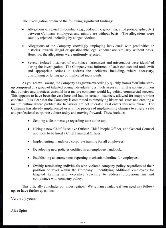 Die beauftragte Anwaltskanzlei, bzw. die «Ermittler» hätten Millionen Dokumente und Nachrichten überprüft und 39 Interviews durchgeführt, heisst es in dem Post.
