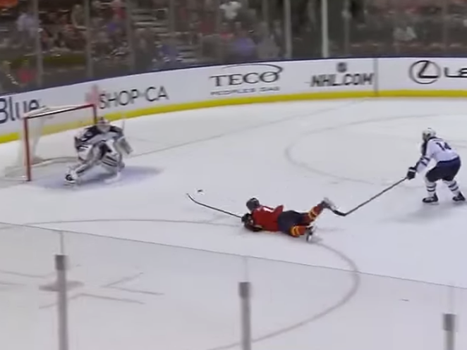 Das nenn' ich Stürmerinstinkt: Bäuchlings auf dem Eis liegend und mit dem Rücken zum Tor einhändig treffen