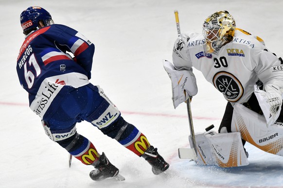 Fabrice Herzog mit der riesigen Chance, die ZSC Lions in Unterzahl in Führung zu bringen. Er attackiert Vauclair an der blauen Linie, erobert sich den Puck, scheitert dann aber an Merzlikins und bringt auch den Abpraller nicht vorbei.