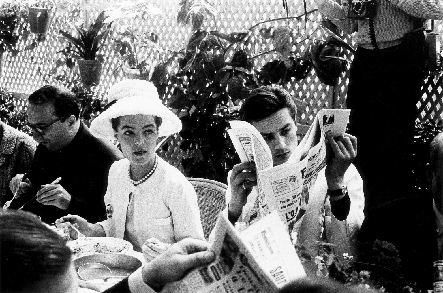 1962: Von allen Männern, mit denen Romy Schneider sich abmühte, war Alain Delon mit Abstand der attraktivste. Hier interessiert er sich allerdings mehr für die neusten Festival-Kritiken.Bild: Paris Match Archive