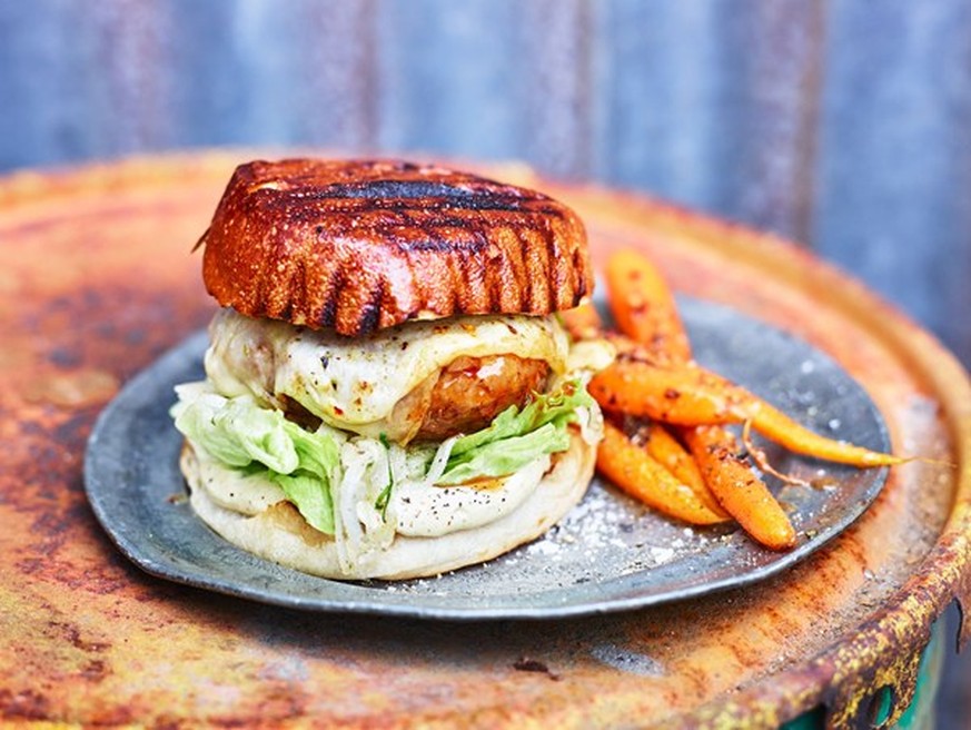 Wild-Burger mit Speck, Cheddar und Wacholderbeeren-Rahm