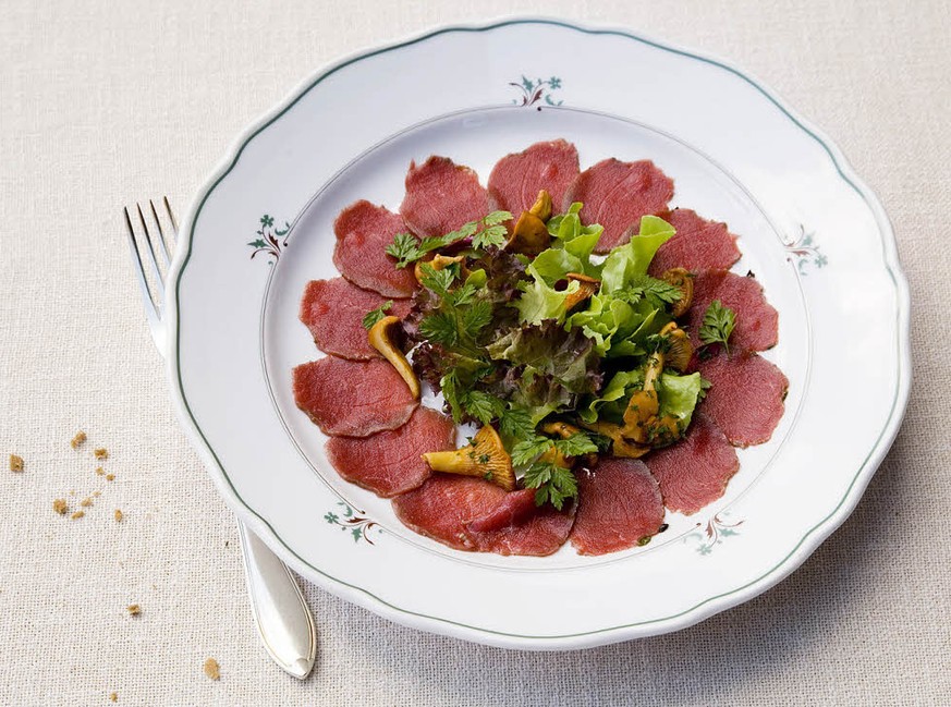 Carpaccio vom Rehnüssli mit gebratenen Eierschwämmli