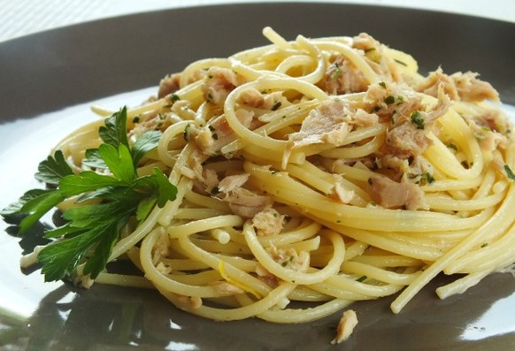 Bei niedriger Hitze ein paar Minuten lang eine fein geschnittene Knoblauchzehe mit ein paar Handvoll fein geschnittener Prezzemolo köcheln lassen. Danach kommt der Inhalt einer abgetropften Dose Thunfisch rein. Wenn die Spaghetti bereit sind, alles untermischen, zusammen mit zwei Esslöffel Butter, dem Saft einer Zitrone und einer ordentlichen Handvoll geriebenen Parmesan. Abschmecken mit Salz und frisch gemahlenem schwarzen Pfeffer.