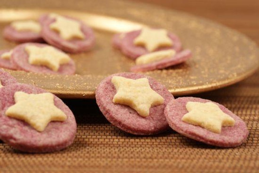 Aus dem roten Teig schliesslich Kreise (Durchmesser ca. 4 cm), aus dem weissen Teig Sterne (Durchmesser ca. 2,5 cm) ausstechen. Sterne mit Wasser bestreichen und auf die Kreise legen. Nun für etwa 12 Minuten backen, fertig!