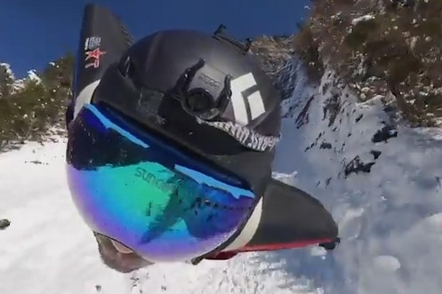 Un casse-cou en wingsuit dévale le flanc d'une montagne à Verbier