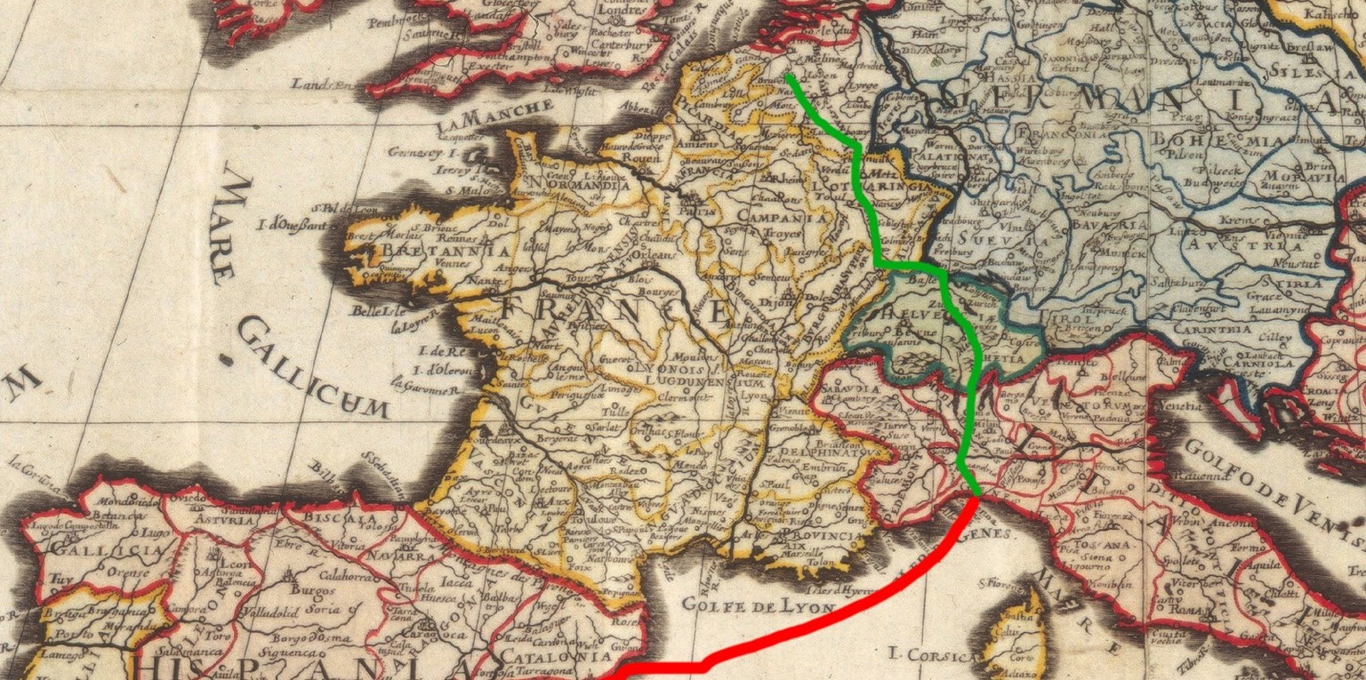 Les Espagnols se débattaient avec d’importantes difficultés logistiques pour acheminer troupes, mercenaires et artillerie vers les Pays-Bas: les vaisseaux espagnols qui partaient des ports de la côte Atlantique de La Corogne, de Laredo et de Saint-Sébastien se heurtaient en effet à l’hostilité des navires hollandais, anglais et français dans la Baie de Biscaye et sur la Manche. Les Espagnols devaient donc ouvrir un autre itinéraire à travers la Méditerranée et par les Alpes s’ils souhaitaient maintenir l’ordre aux Pays-Bas.